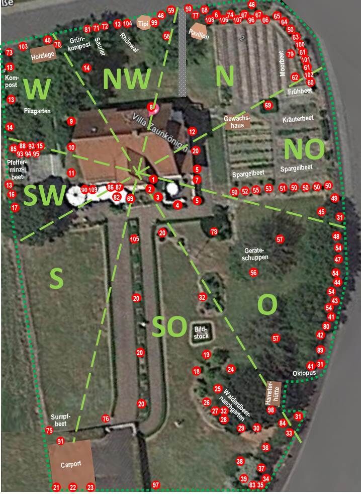 Wir haben weit über 100 verschiedene Obstbäume und -sträucher, die meisten davon im Park, der die Ferienwohnung Villa Zaunkönigin umgibt. Man kann also durchaus schon von einem Obst-Arboretum sprechen. Obstpflanzen, die wir eingetopft haben oder die nur den Sommer über im Garten gepflanzt werden (wie z.B. Zitruspflanzen , Solanum- und Physalis-Arten etc.) sind auf der Liste und der Karte nicht aufgeführt, da ihr Standort ja immer wieder wechselt. Im Folgenden listen wir erst einmal auf, was es da alles zu entdecken gibt. Unter der Liste findet sich eine Übersichtskarte, die wir zur besseren Orientierung in (acht) Himmelsrichtungen unterteilt haben und in der die Orte der verschiedenen Bäume oder Sträucher markiert sind. Damit wir nicht selbst in dieser Fülle die Übersicht verlieren, hängen an den Pflanzen Aluminium-Etiketten (bei Sorten, die mehrfach vorhanden sind, aber meist nur einmal). Vielleicht kennen Sie ja einige der aufgelisteten Pflanzen noch nicht und sind neugierig geworden? Als Hilfestellung haben wir die wissenschaftlichen (lateinischen) Pflanzennamen in der Liste mit Internetseiten verknüpft, auf denen Sie zu den jeweiligen Obstsorten spezielle Informationen erhalten. Nach Absprache dürfen Sie gerne einmal von den verschiedenen Obstsorten naschen. Sie wundern sich vielleicht, dass sich neben heimischen und ausländischen Obstsorten auch ein paar Nadelbäume befinden, die man in dieser Liste vielleicht nicht erwarten würde, aber auch die stehen manchmal auf unserer Speisekarte (aus ihnen kann leckeren Sirup und Gelee herstellen). Vorsicht: Da in unserem Park aber (wie überall in der Natur) auch mehrere extrem giftige Pflanzen stehen (z.B. Eiben), sollten Sie vor jeder Kostprobe erst einmal mit uns reden und insbesondere auch Ihre Kinder im Auge behalten.