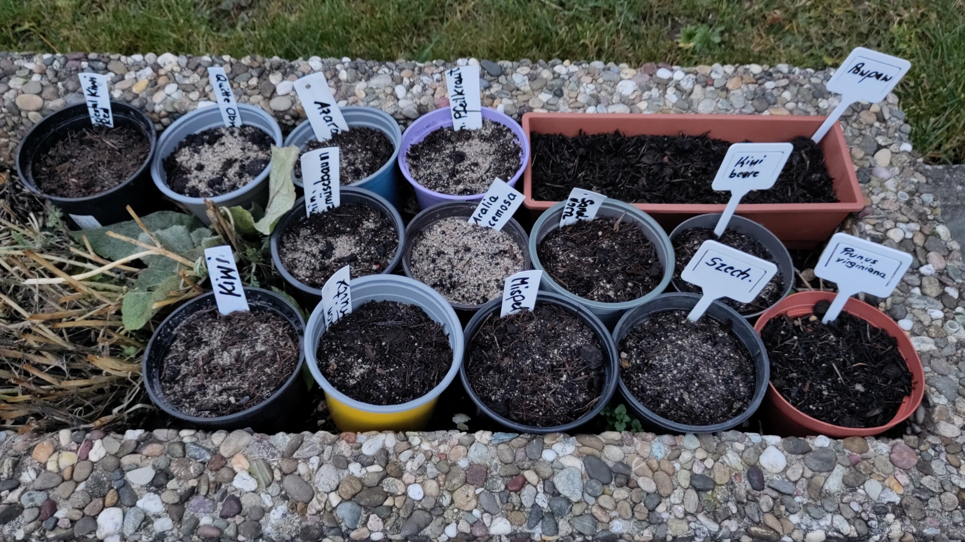 Im September 2024 wurde es zunehmend kälter und es regnete immer wieder einmal, manchmal auch sehr stark. Das Regenwetter war aber gerade passend, um noch ein paar weitere Obstbäume und -büsche zu pflanzen. Die Lotuspflaume beim Carport zog nach oben zum Gemüsegarten um, wo für sie noch ein weiterer Bestäubungspartner gepflanzt wurde. Dafür gab es nun am Carport-Spalier Platz für eine chinesische Dattelpflanze. Weitere Neuzugänge waren ein Gelbhornstrauch, ein Blauschotenstrauch, ein Chum-Baum (eine Kreuzung aus der Sandkirsche und der japanischen Pflaume) und ein Schneeball "Eskimo". Für unsere Nordwand schenkten uns Feriengäste der Villa Zaunkönigin eine Rankpflanze, die Schatten gut verträgt, nämlich ein chinesisches Spaltkölbchen, für das wir gleich einmal ein Klettergitter anbrachten. Unsere anderen Spalierpflanzen waren inzwischen schon gut gewachsen, sodass wir beschlossen, ihre Spaliere zu erweitern - damit können sie sich auch in den kommenden Jahren noch weiter ausbreiten. Ansonsten war im Garten Ernte-Saison: Die Kartoffel- und Zwiebelernte war in diesem Jahr zwar nicht so üppig, dafür hatten wir aber eine prima Ernte an Perilla-Blättern, die wir teils einem leckeren Kräutersirup verarbeiteten, teils zu Grillfleisch aßen. Unsere Gemüse-Soja-Pflanzen (Edamame) hatten wir zwar etwas spät ausgesäht, aber sie hatten sich doch ganz gut entwickelt und trugen eine Menge leckere Früchte. Die Blüten unserer Apfelbäume und unseres Walnussbaums waren im Frühjahr erfrohren, sodass hier die Ernte völlig ausfiel. Dafür konnten wir aber Unmengen von Haselnüssen einsammeln und trocknen. Getrocknet wurden auch viele Samen für einen hoffentlich guten Garten-Start im nächsten Jahr.