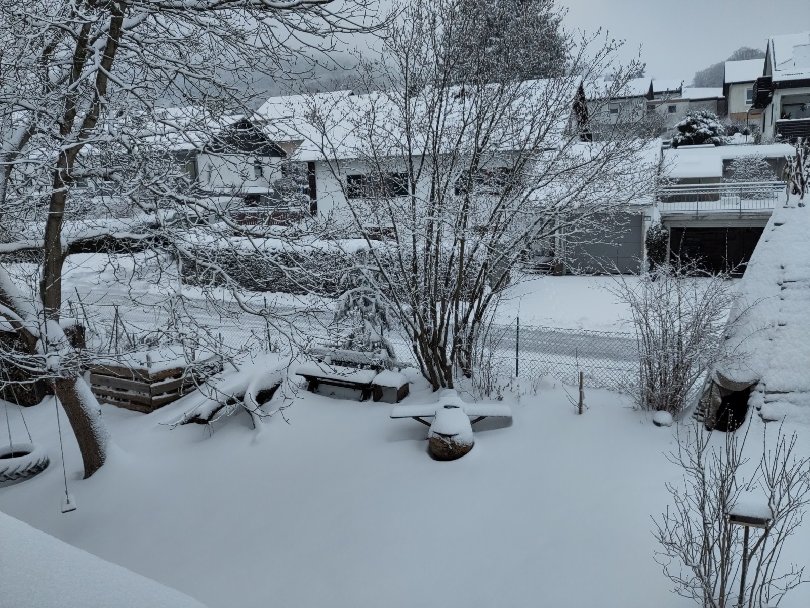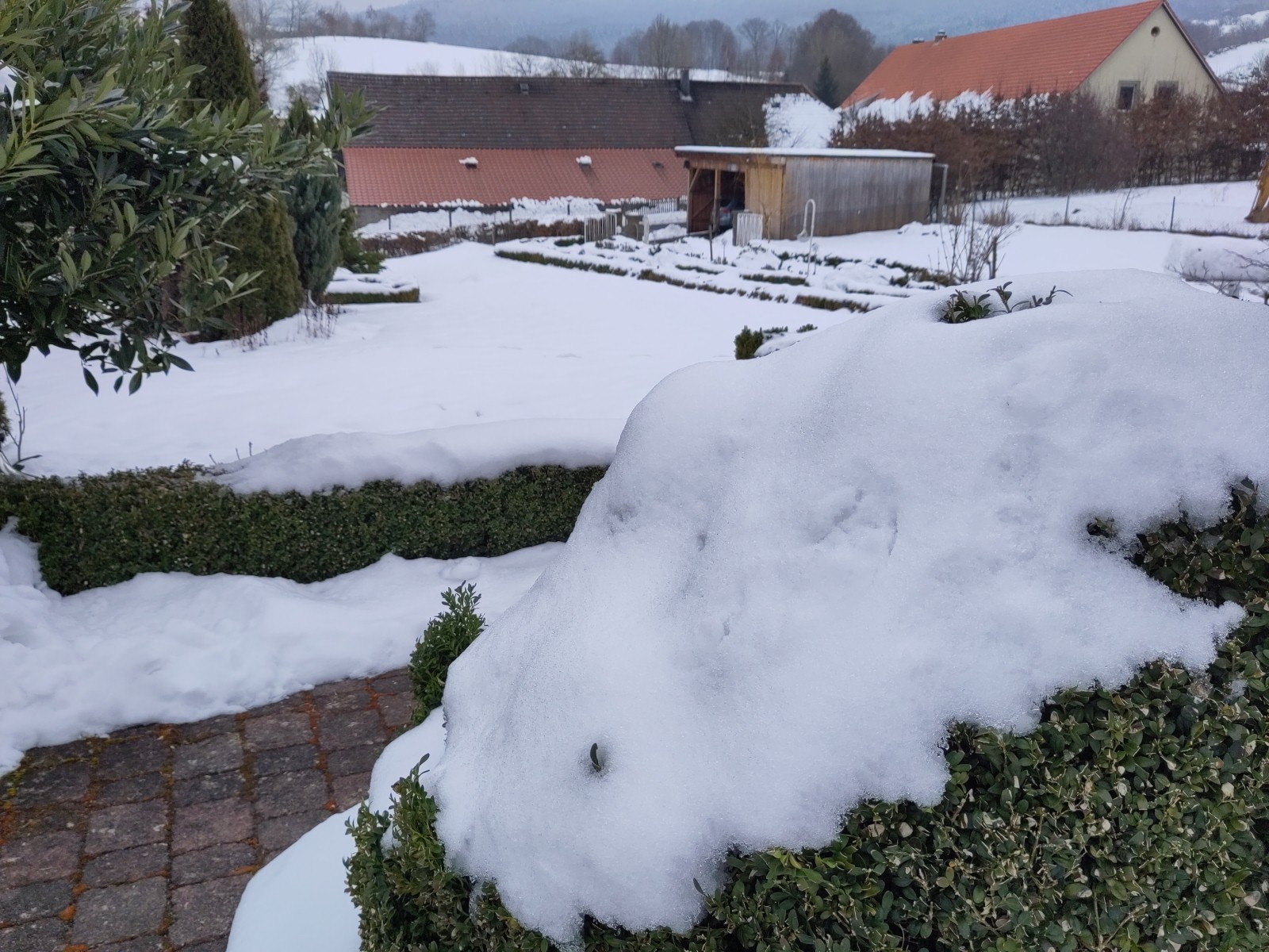 Anfang November 2023 regnete es unaufhörlich, als ob das Grundwasser für das gesamte nächste Jahr wieder aufgefüllt werden sollte. Die Bäume und Büsche nahmen wunderschöne herbstliche Farben an und bereiteten sich auf den Winter vor, indem sie sich von ihrem Laub verabschiedeten. Die Sonnenstunden wurden weniger und die Tage merklich kühler. Manchmal war ein Teil der Landschaft in Nebelschwaden gehüllt. In den Wäldern und auf den Wiesen wuchsen Pilze und bereicherten unsere Speisekarte (super-lecker: panierte Riesenschirmlinge). Ende November hörte der Regen auf, die Temperaturen fielen deutlich unter null Grad und es schneite kräftig: Nun war alles war mit Schnee bedeckt.