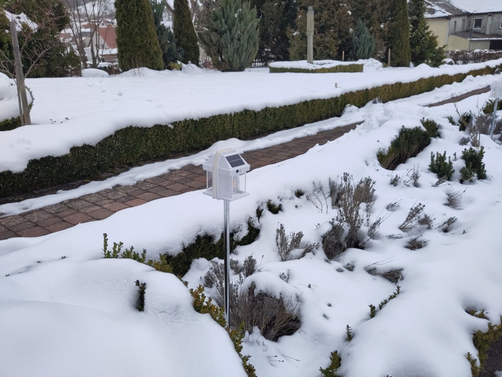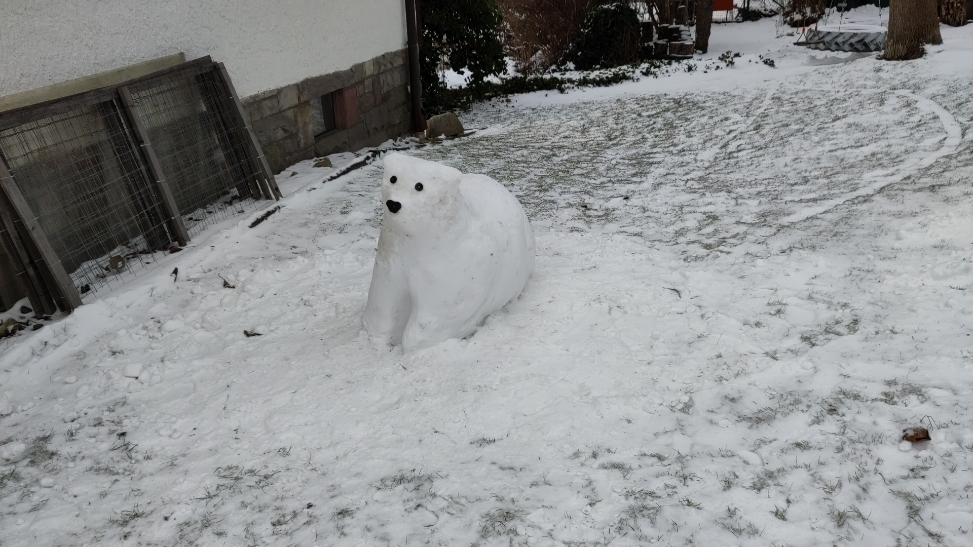 Der Januar 2026 begann gleich einmal mit einer richtig ordentlichen Menge Schnee. Auf dem Kinderspielplatz hinter dem Haus kuschelte sich ein Eisbär in den Schnee und unten im Park entstand ein Schnee-Obelisk. Als es dann richtig kalt wurde (unter -10 °C) fanden wir im Schnee die Spuren eines Rehs, das sich in unserem Garten umsehen wollte und sicher auch in unserem Obstarboretum neue kulinarische Erlebnisse sammelte. Als es Mitte des Monats ein paar wärmere Tage gab, taute der Schnee taute völlig ab. Kurz danach gab es dafür aber umso reichlicher Neuschnee, der dann auch liegenblieb, denn die Temperaturen blieben nahe am Nullpunkt. Alles in allem hatten wir also ideale Wintersport-Bedingungen. Im Wohnzimmer der Ferienwohnung gab es ein paar kleinere Veränderungen: Am Klavier gibt es jetzt eine Lampe, mit der man die Noten beleuchten kann, und die alte Efeutute wurde endgültig durch eine neue Pflanze ersetzt. Draußen im Park wurden Solar-Laternen aufgestellt, damit unsere Gäste (und natürlich auch wir selbst) in den immer noch recht langen Nächten den Weg besser erkennen konnten. Die Strahler, die wir dort verbaut hatten, kamen an die Hauswand, um auch der Pfad vom Haus zur Frühlingstraße zu beleuchten.