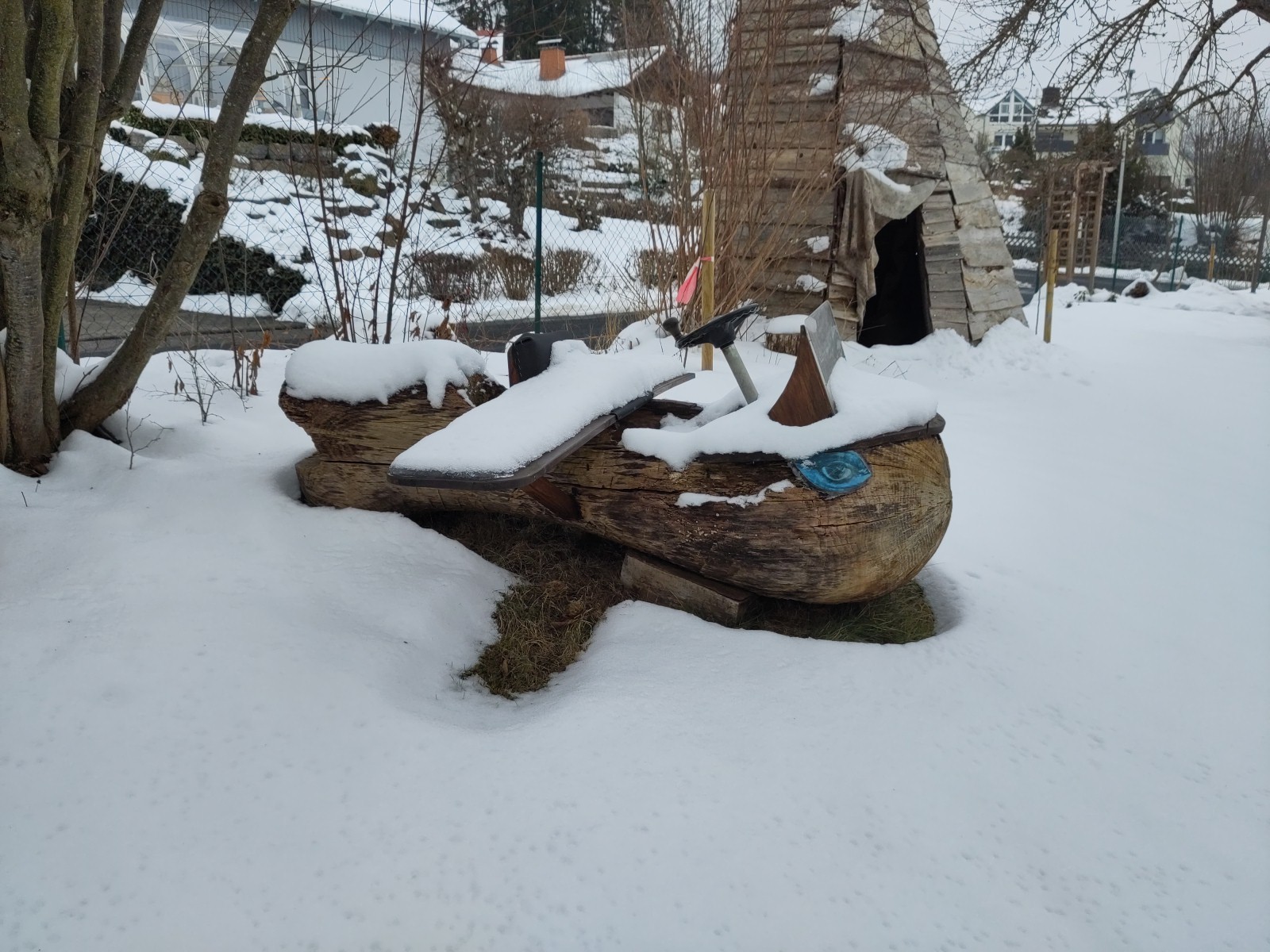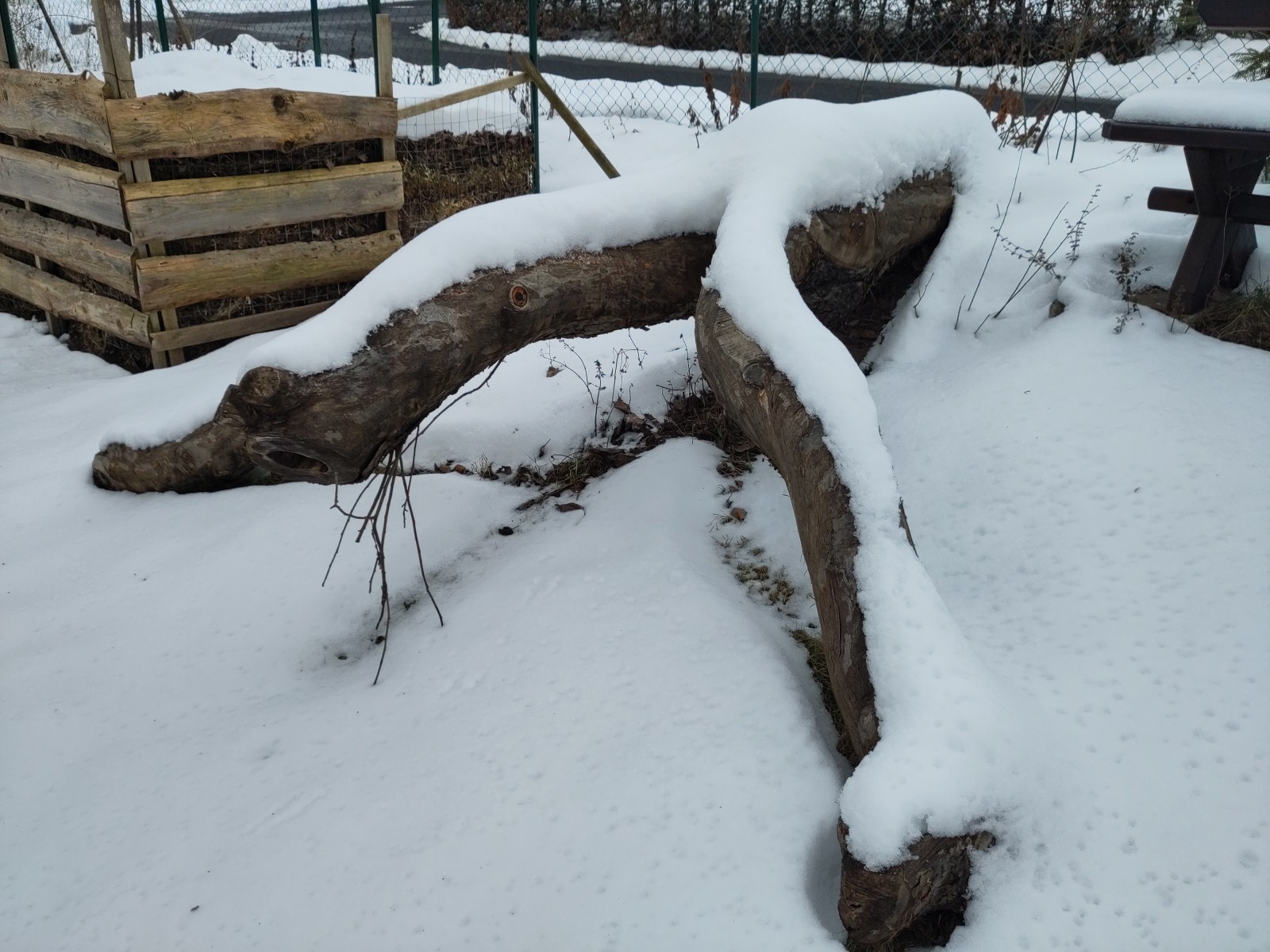 Der Dezember 2024 begann recht regnerisch, aber kurz vor Weihnachten bekamen wir dann doch etwas Schnee. Wir nutzten die etwas schöneren Tage, um mit viel Sand zwei weitere Spargelbeete vorzubereiten. Da wir inzwischen über 100 verschiedene, zum Teil recht exotische Fruchtbäume und -sträucher haben und immer wieder neue hinzukommen, beschlossen wir, erst einmal überall Etiketten aufzuhängen - sonst verliert man da ja leicht die Übersicht. Für interessierte Feriengäste erstellten wir dazu auch eine Obst-Arboretum-Seite, auf der wir unsere Obstsorten auflisten und ihre Position auf einer Übersichtskarte zeigen. Vielleicht ist da ja etwas dabei, das sie interessiert oder das sie noch nicht kennen. Nach Absprache dürfen unsere Gäste auch gerne Kostproben nehmen. Neben der Hamsterhütte hat sich ein Gebirgs-Oktoups angesiedelt (Octopus sylvaticus; bitte nicht füttern). Normalerweise sind diese seltenen Tiere Meister der Tarnung, aber zur Paarungszeit sind sie recht gut erkennbar. Wie alle anderen Kraken haben sie 8 Arme, 3 Herzen und 9 Gehirne. Ein weiteres seltsames Tier, ein Anodontosaurus, findet sich auf unserem Kinderspielplatz (eine Beschreibung des Reitsauriers findet sich auf unserer Seite Kinder spielen im Park).