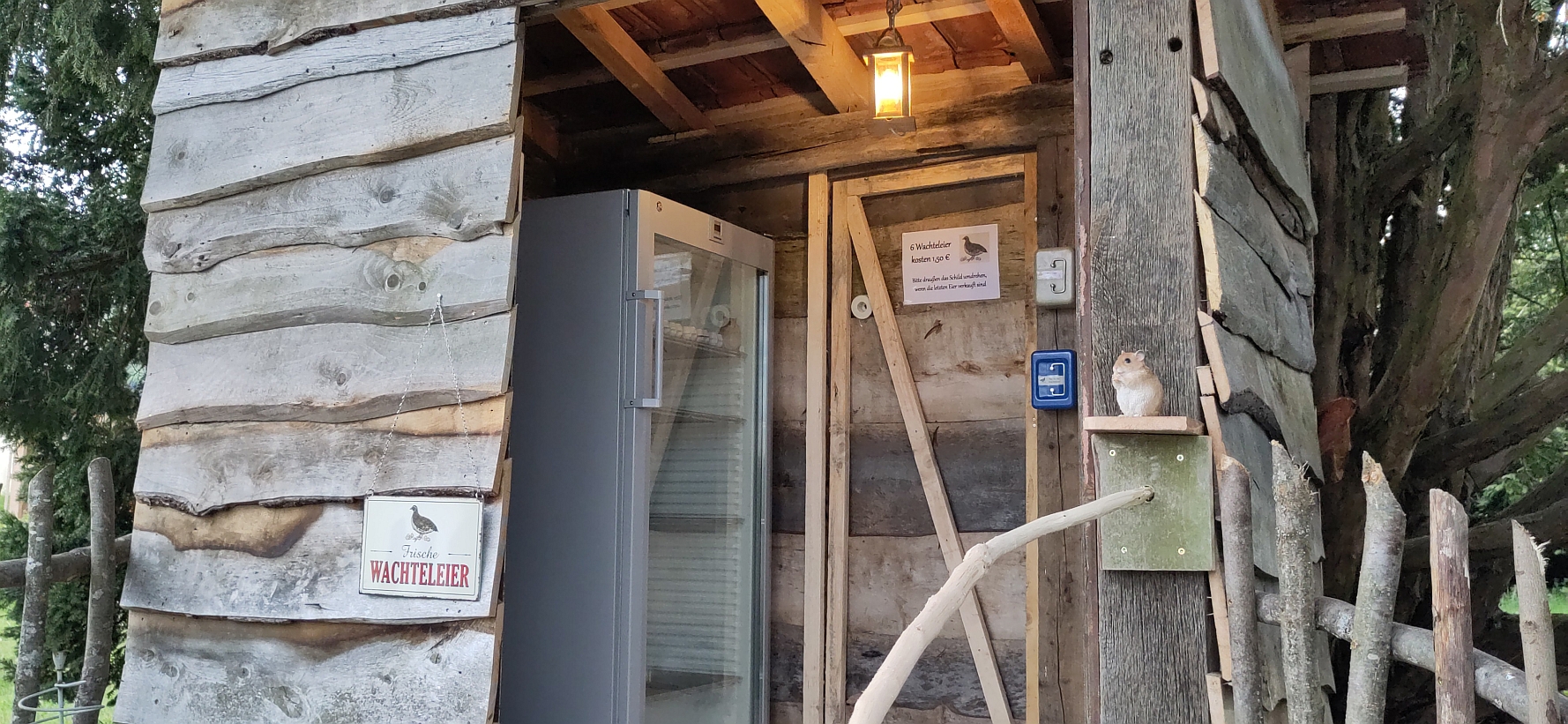 Der Hamster hält gerade Winterschlaf. Um ihn nicht zu stören, ist die Hütte geschlossen. Im Frühling wird sie wieder geöffnet, sobald es Pflanzen für den Garten gibt. Wachteleier gibt es zur Zeit auch nicht: Die Wachteln unseres Nachbarn Ewi sind "in Mauser gegangen"; sie werden erst im Frühling wieder Eier legen.