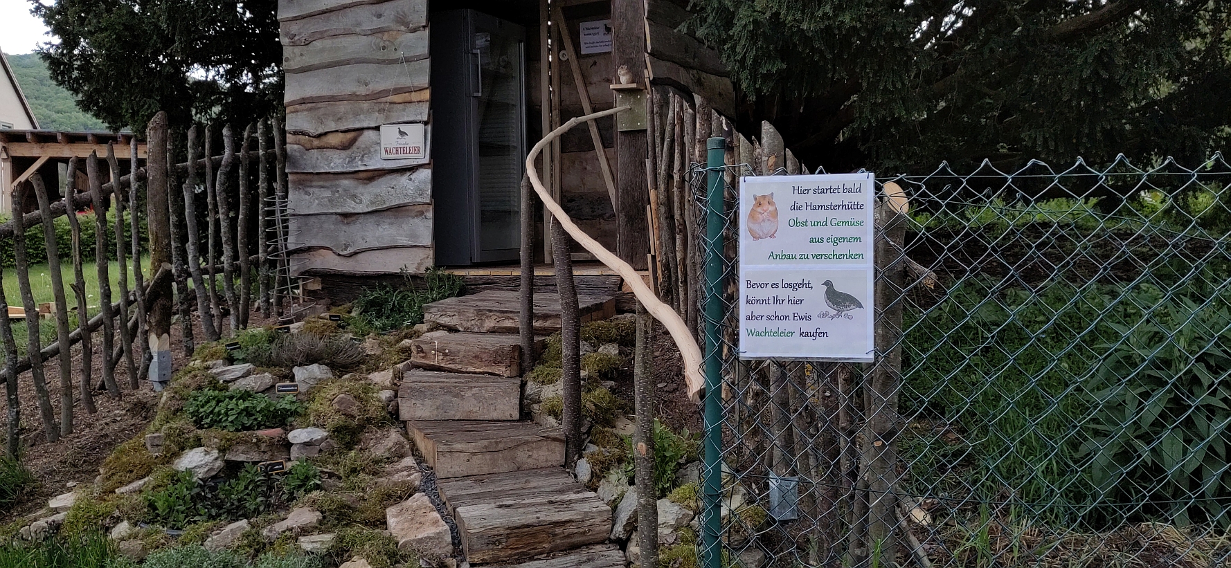 Wir haben einen riesengroßen Gemüsegarten, einige alte Obstbäume und eine ganze Menge unterschiedlicher neu gepflanzter Obstbäume und -sträucher. Das Gärtnern macht uns also offensichtlich Freude. Aber wer soll das denn alles essen? Selbst wenn man einiges konserviert, trocknet, einfriert oder sonstwie haltbar macht, ist das alles doch viel zu viel für zwei Personen. Also hatte meine Frau Regina die Idee, einen Stand aufzumachen, wo wir all das, was wir übrig haben, einfach verschenken. Gerne dürfen unsere Besucher und Nachbarn hier frisches und gesundes Obst und Gemüse hamstern - in unserer Hamsterhütte. Wenn wir im Frühjahr Salat, Gemüse und andere (zum Teil recht exotische) Pflanzen vorziehen, stehen dort auch noch die überzähligen Pflänzchen und warten auf ein neues Zuhause. Unsere Hamsterhütte befindet auf dem Gelände der Familien-Ferienwohnung Villa Zaunkönigin in Haselbach; ihr Eingang ist in der Neulandstraße.