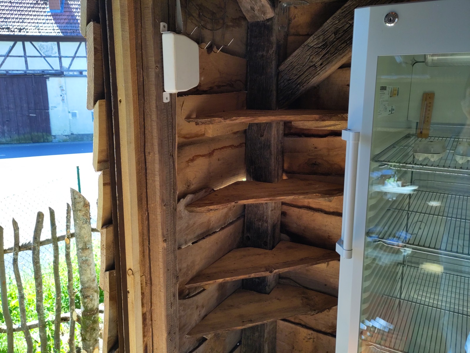 Ein befreundeter Biogärtner schenkte uns einen riesigen Kühlschrank, den er nicht mehr benötigt. Von verschiedenen Leuten erhielten wir günstig alte Balken, Bretter, Dachziegeln und einen Rolladen. Unser Nachbar Ewi ist Schreinermeister und half uns fleißig beim Aufbau. In der folgenden Bilderleiste zeigen wir die Entstehung unserer Hamsterhütte.