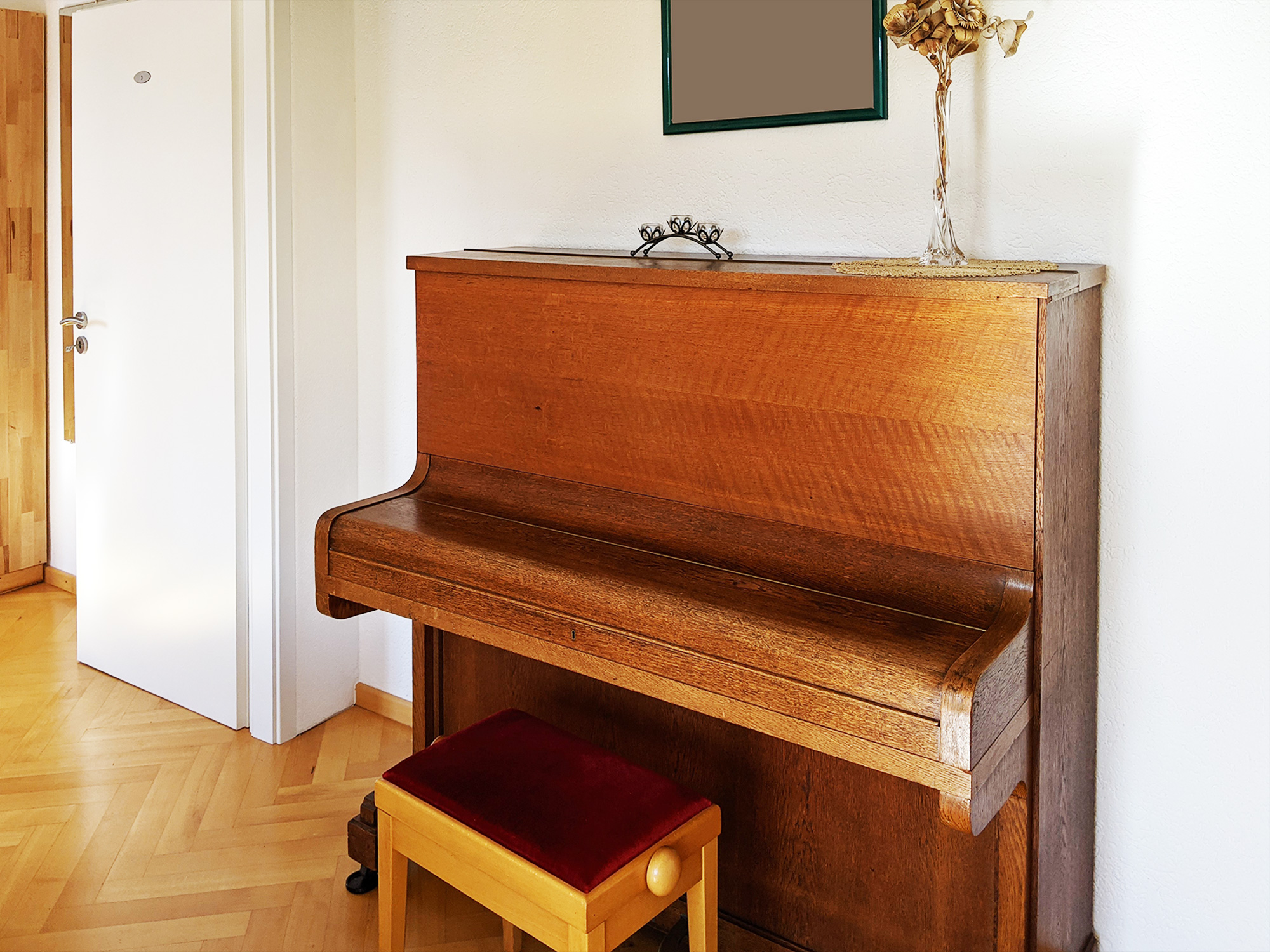 Wenn Sie am Abend Ihre Lieblingssendung am Fernseher sehen möchten, ist auch das kein Problem. Der Fernseher hängt etwas unscheinbar über dem Klavier, sodass viele ihn erst bemerken, wenn sie nach ihm suchen; er hat SAT-Empfang und kann auch Sendungen über das Internet empfangen. Wenn Sie bei Netflix oder anderen Anbietern einen Vertrag haben, können Sie also auch Ihre Zugangsdaten in den Koffer packen. Außerdem ist der Fernseher an einen Blu-ray-Spieler angeschlossen. Damit können Sie mitgebrachte Filme oder auch die DVDs aus dem Jugendzimmer abspielen.